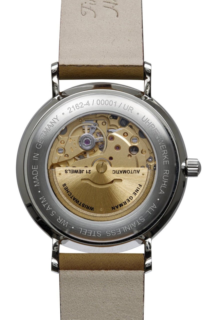 Abgerundetes K1-Sicherheitsglas. Edelstahlgehäuse. Italienisches Lederarmband. Zurückhaltende Gestaltung des Zifferblattes mit arabischen Zahlen in geheimnisvollem Dunkelgrün. Alle diese Komponenten vereint ergeben eine Herrenuhr, die mit schlichter Eleganz eine handwerkliche Demut ausstrahlt. Das Automatikuhrwerk der Bauhaus 21624 stammt von der japanischen Traditionsmanufaktur Citizen/Miyota und steht für langlebige Qualität. Durch den Glasboden des Gehäuses können Werk und Rotor betrachtet werden. Eine im Zifferblatt untergebrachte, große Wochentagsanzeige dient nicht nur für Uhrenkenner als besonderer Blickfang. Die Datumsanzeige auf der Drei-Uhr-Position rundet das Gesamtbild ab. Von A bis Z ein gelungener Klassiker in schlichter Farbkombination, der gerade deshalb besonders variabel kombiniert werden kann. Ist dein Outfit bereit für den Ausflug zum schlossartigen Landsitz?