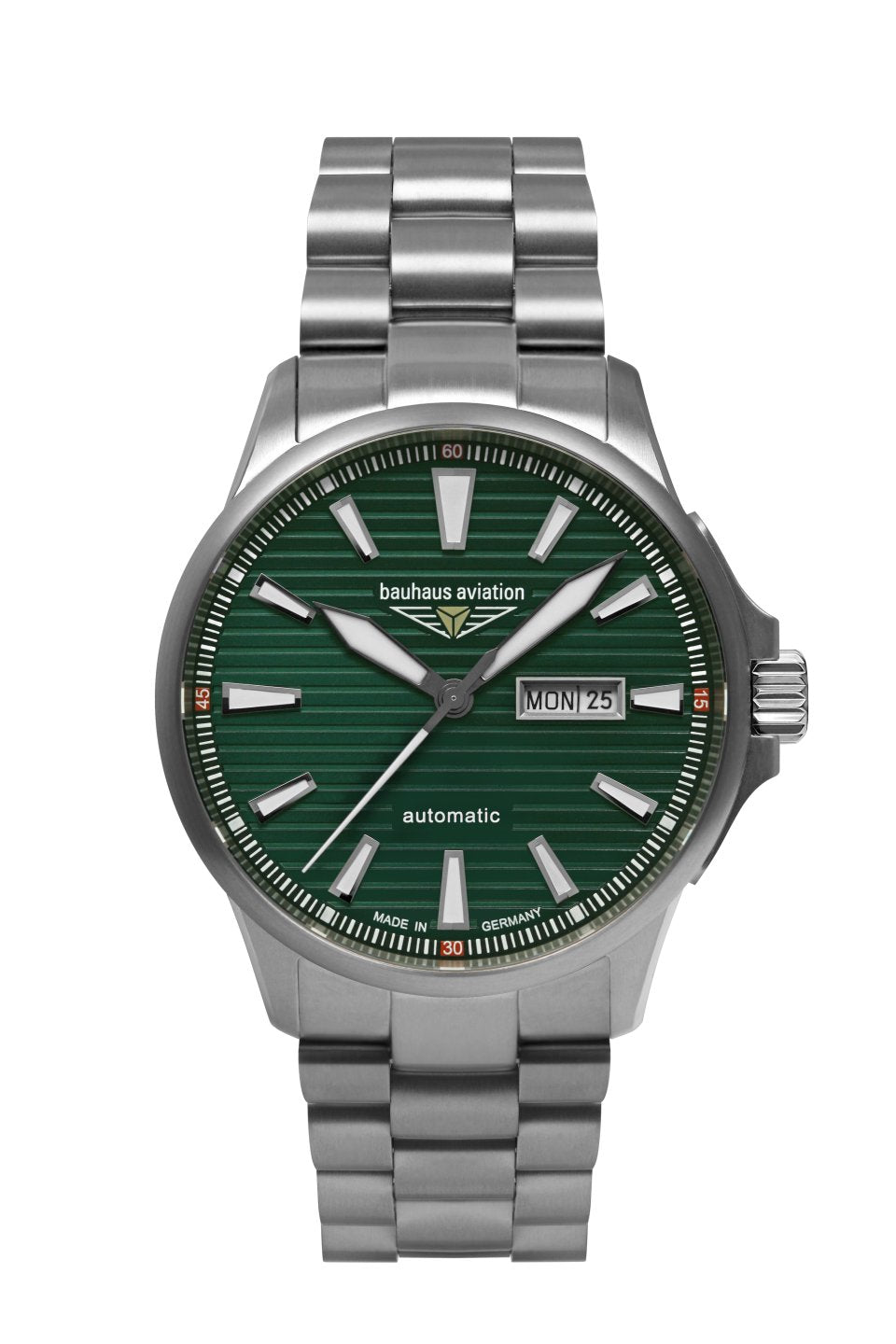 Abgerundetes Saphirglas. Titangehäuse. Titanarmband. Ausdrucksstarke Gestaltung des smaragdgrünen Zifferblatts mit mit horizontaler Struktur, die an Bauteilelemente aus der Avionik erinnert. Alle diese Komponenten vereint ergeben eine Herrenuhr, die trotz Eleganz eine kräftige Maskulinität ausstrahlt. Das Automatikuhrwerk der Bauhaus 2866M-4 stammt von der japanischen Traditionsmanufaktur Citizen/Miyota, steht für langlebige Qualität und zeichnet sich durch eine Ergänzung des Datums durch eine Wochentagsanzeige aus. Durch den Glasboden des Gehäuses können Werk und Rotor betrachtet werden. Von A bis Z ein gelungener Klassiker in schlichter Farbkombination, der gerade deshalb besonders variabel kombiniert werden kann. Ist dein Outfit bereit für den Ausflug zum schlossartigen Landsitz?