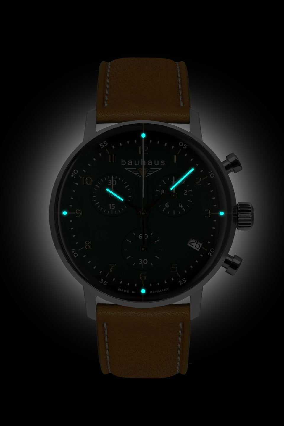 Abgerundetes K1-Sicherheitsglas. Edelstahlgehäuse. Italienisches Lederarmband. Zurückhaltende Gestaltung des Zifferblattes mit arabischen Zahlen und edlem Dunkelgrün. Alle diese Komponenten vereint ergeben einen Herrenchronographen, der trotz sportlicher Funktion eine würdevolle Eleganz ausstrahlt. Maßgeblich hierzu tragen neben den goldfarbenen Zeigern und Indices die in das Zifferblatt leicht eingelassenen Komplikationen für Zwischenzeiten und Kleiner Sekunde bei. Das zuverlässige Quarzuhrwerk der Bauhaus 2096 stammt von der Schweizer Traditionsmanufaktur ETA und steht für langlebige Qualität. Die Datumsanzeige auf der Vier-Uhr-Position und ein hellbraunes Lederarmband runden das Gesamtbild ab. Von A bis Z ein gelungener Klassiker in eleganter Farbkombination. Ist dein Outfit bereit für den Ausflug zum schlossartigen Landsitz?