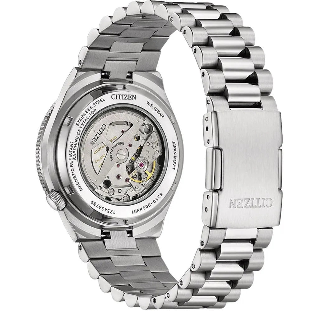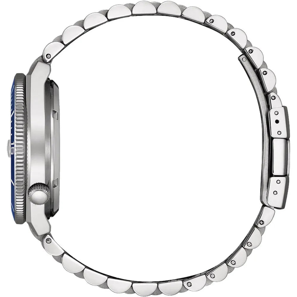 Die Tsuyosa erreicht neue Ufer: Die Citizen NJ0230-59L trägt ein mechanisches Uhrwerk vom Kaliber 8210 im Herzen, das in aufgezogenem Zustand für eine Gangreserve von 40 Stunden sorgt. Das Gehäuse aus silberfarbenem, gebürstetem Edelstahl schmiegt sich perfekt an dein Handgelenk und bildet eine edle Kombination mit dem hochwertigen Glieder-Armband. Das Zifferblatt glänzt dank Sonnenschliff je nach Lichteinfall in unterschiedlichen Blau-Tönen. Hinzu kommen ein kratzresistentes Saphirglas, eine Datumsanzeige mit Lupe auf der Drei und ein Preis, der nicht zu schlagen ist. Um die Tsuyosa endlich vollständig urlaubstauglich zu machen, wurde neben einer unidirektionalen Taucherlünette die Druckresistenz auf 10 Bar erweitert. Das perfekte Update zu deinem Holiday-Outfit.