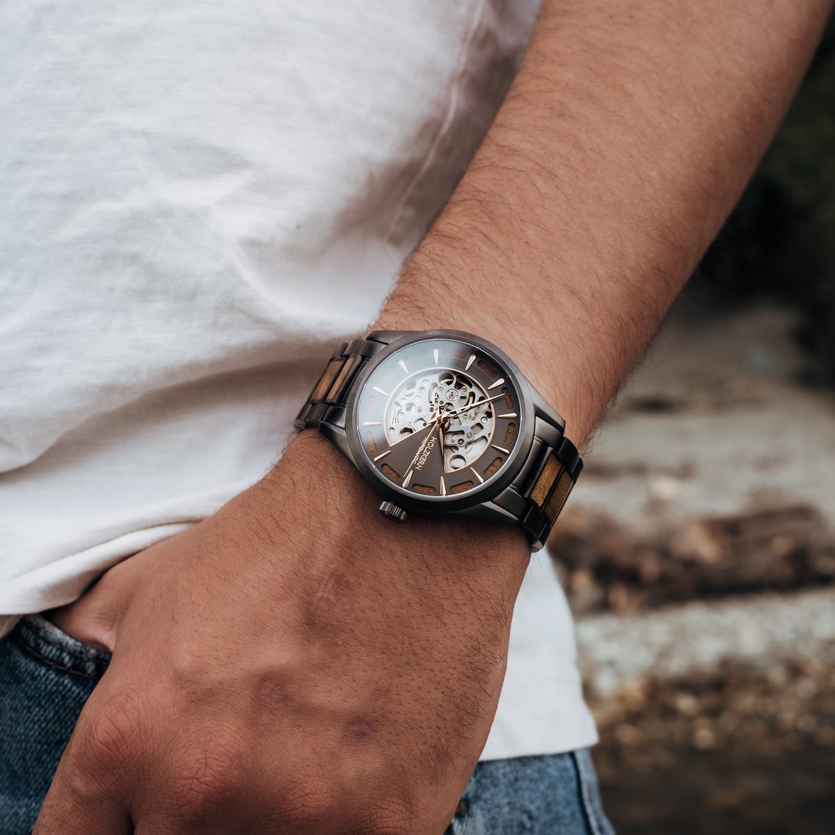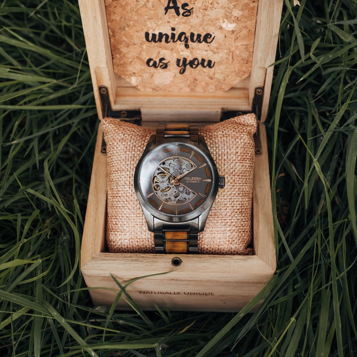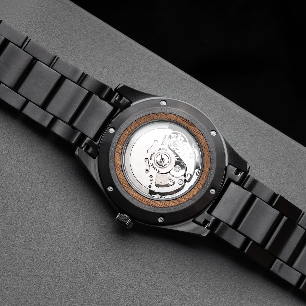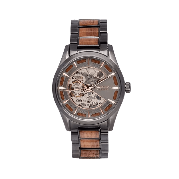 Bereite dich auf einen Auftritt vor, der einschlägt wie ein Komet. Die Tenoumer besticht durch ein massives 42 mm Gehäuse aus dunkelgrauem Edelstahl, dessen kühles, mattes Finish an die unerbittliche Weite der Sahara erinnert. Doch im Zentrum dieses Kraters wartet ein warmer, lebendiger Kern: Das skelettierte Zifferblatt aus fein gemasertem Koaholz. Koa, das "Holz der Krieger" aus Hawaii, ist berühmt für seinen goldenen Schimmer und seine einzigartige Textur, die unter dem Glas bei jeder Bewegung das Licht einfängt. Das wahre Highlight für Technik-Enthusiasten schlägt gut sichtbar unter der Oberfläche aus Saphirglas: Ein hochwertiges Automatikuhrwerk der Firma Seiko. Keine Batterien, kein Stillstand... diese Uhr lebt von deiner Energie und wandelt jede deiner Bewegungen in präzise Zeit um. Das größenverstellbare Armband führt das Design konsequent fort und kombiniert die Robustheit des dunkelgrauen Edelstahls mit der Wärme des Koaholzes. Die Holzkern Tenemour ist eine Uhr, die Gegensätze überbrückt und feiert: Steinzeitliche Geschichte trifft auf modernste japanische Ingenieurskunst.