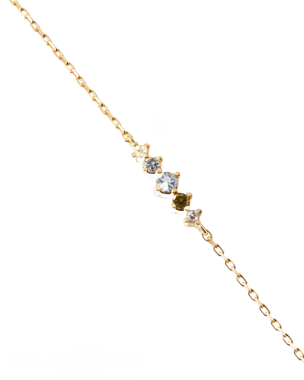 Fünf leise Zirkoniasteine in unterschiedlichen Farben in Reihe angeordnet, bilden das Hauptelement dieses Damen-Armbandes, das an die fragile Anordnung funkelnder Himmelskörper erinnert. Erst in der Kombination mit der zierlichen, vergoldeten Ankerkette aus Sterling Silber entfaltet das zurückhaltende Schmuckstück seine volle Pracht. Für einen galaktischen Auftritt.