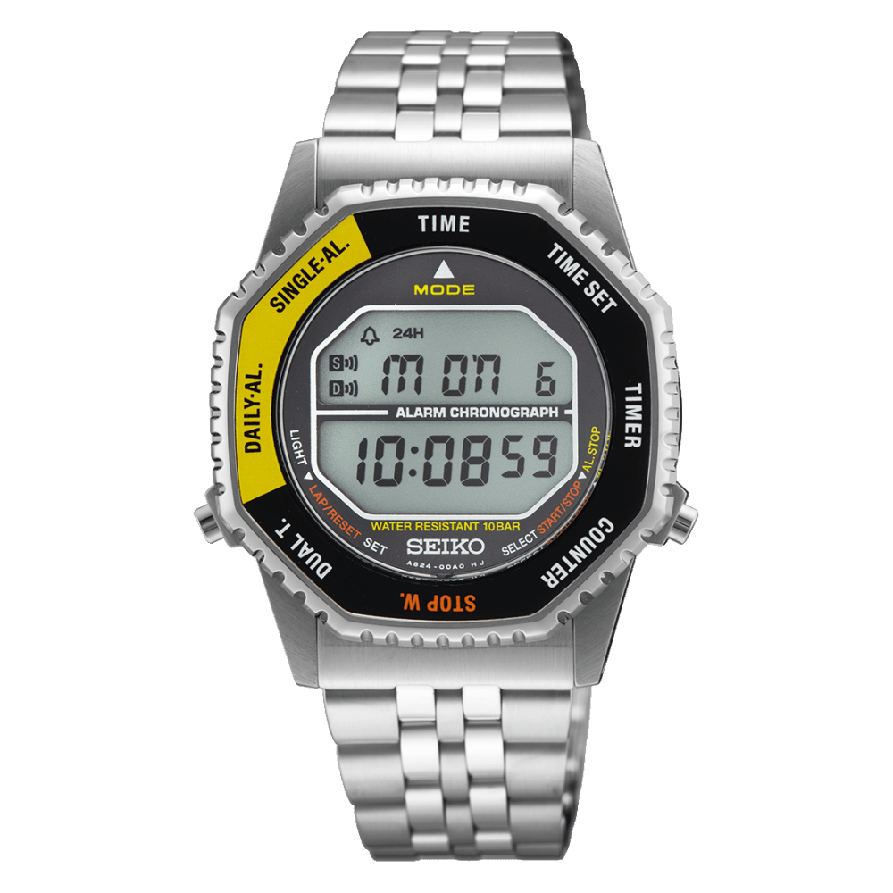 In den 80er-Jahren präsentierte SEIKO ihre bis dato einzige Digitaluhr. Und diese feiert nun ihre vielumjubelte Renaissance. Ausgestattet mit dem hauseigenen Quarzkaliber A824 verfügt die Uhr über Zusatz-Funktionen wie einer Stoppuhr, einer zweiten Weltzeit, einem Timer und einem Alarm. Das einzigartige an der Uhr: nicht durch Knopfdruck, sondern durch Drehen der achteckigen Lünette schaltest Du durch die einzelnen Funktionen. Farblich orientiert sich die SMGG ebenfalls an dem futuristischen Coulourblocking vergangener Tage und setzt auf eine Signalfarben-Kombination aus Gelb und Schwarz. Armband und Gehäuse aus Edelstahl verleihen der Uhr ihre hochwertige Business-Note. Diese Uhr ist zurück wie nie zuvor.