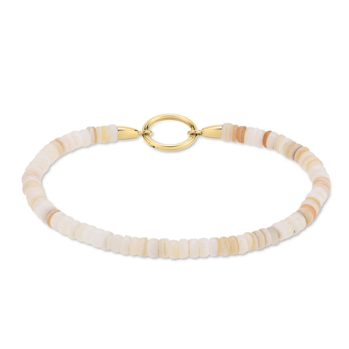 Femininer Schmuck für das lockere Girlie-Feeling. Die Verschlusselemente bestehen aus Edelstahl, welcher in Gelbgold plattiert wurde. Hauptfarbgeber dieses Schmuckstücks sind jedoch die Muschelstein-Beads in feinen Pastelltönen aus Beige und Weiß. Für deinen frischen, fröhlichen Power-Look.