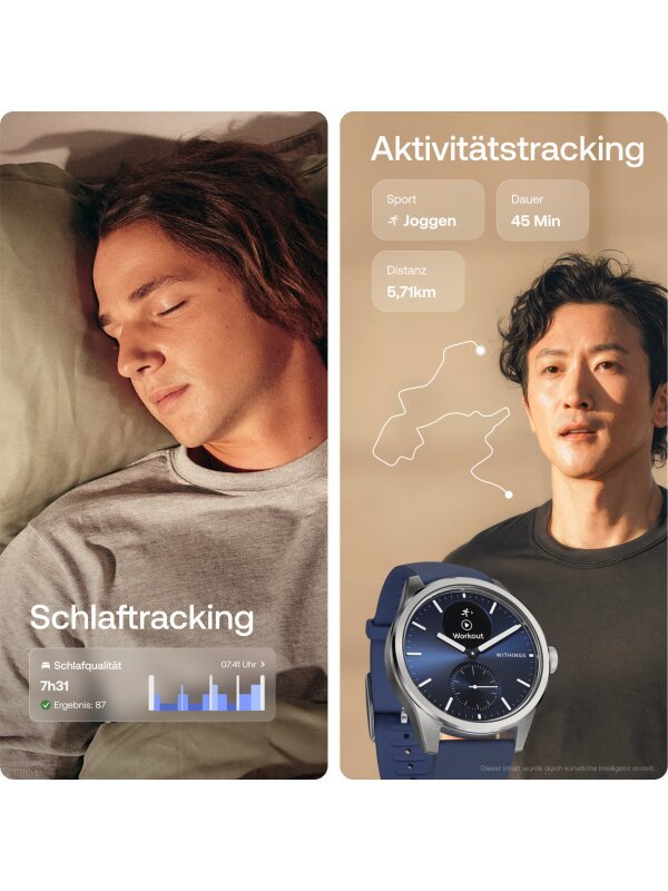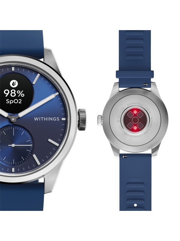 Die einzige klinisch validierte Smartwatch weltweit. Withings hat jahrelange Erfahrung im Bereich der Entwicklung und Vernetzung von Fitnessprodukten und arbeitet mit führenden Experten im Gesundheitsbereich. Dies beweisen sie in Hochkultur mit der Scanwatch 2 Smartwatch-Kollektion. Eine perfekte Symbiose aus stilvoller Businesswatch und hochmodernem Gadget wurde dadurch erreicht, dass dem tiefblauen Sonnenschliff-Zifferblatt ein digitales Komplikationsfenster hinzugefügt wurde, über welches die Zusatzfunktionen, wie Fitnesstracking, medizinisch genaues EKG oder Schrittzähler abgerufen werden können. Hinzu kommen qualitativ hochklassige Materialien. Das Armband in Blau wurde aus Kautschuk (Fluoroelastomer) und das silberfarbene Gehäuse aus gebürstetem Edelstahl gefertigt, hält somit einem Druck von 5 Bar Stand. Geschützt wird dein neues Lieblings-Accessoire durch kratzresistentes Saphirglas. Die eleganteste Form des digitalen Fortschritts.