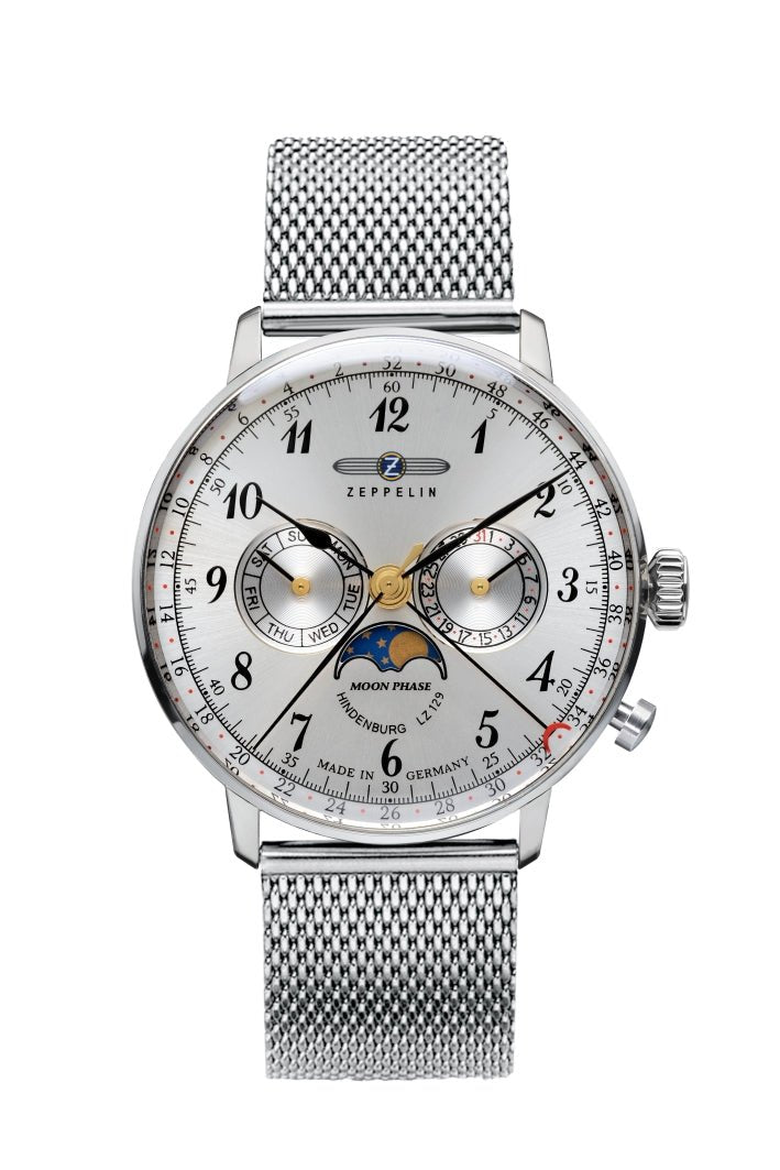 Ein elegantes Meisterwerk für Männer. Die Zeppelin Hindenburg Uhr verbindet traditionelles Design mit einem Hauch von Retro-Charme. Besonders beeindruckend sind die schöne Mondphasenanzeige und das silberne Sonnenschliff-Zifferblatt mit schwarzen Zeigern. Diese Uhr mit Edelstahlarmband ist perfekt für alle, die klassische Eleganz lieben.