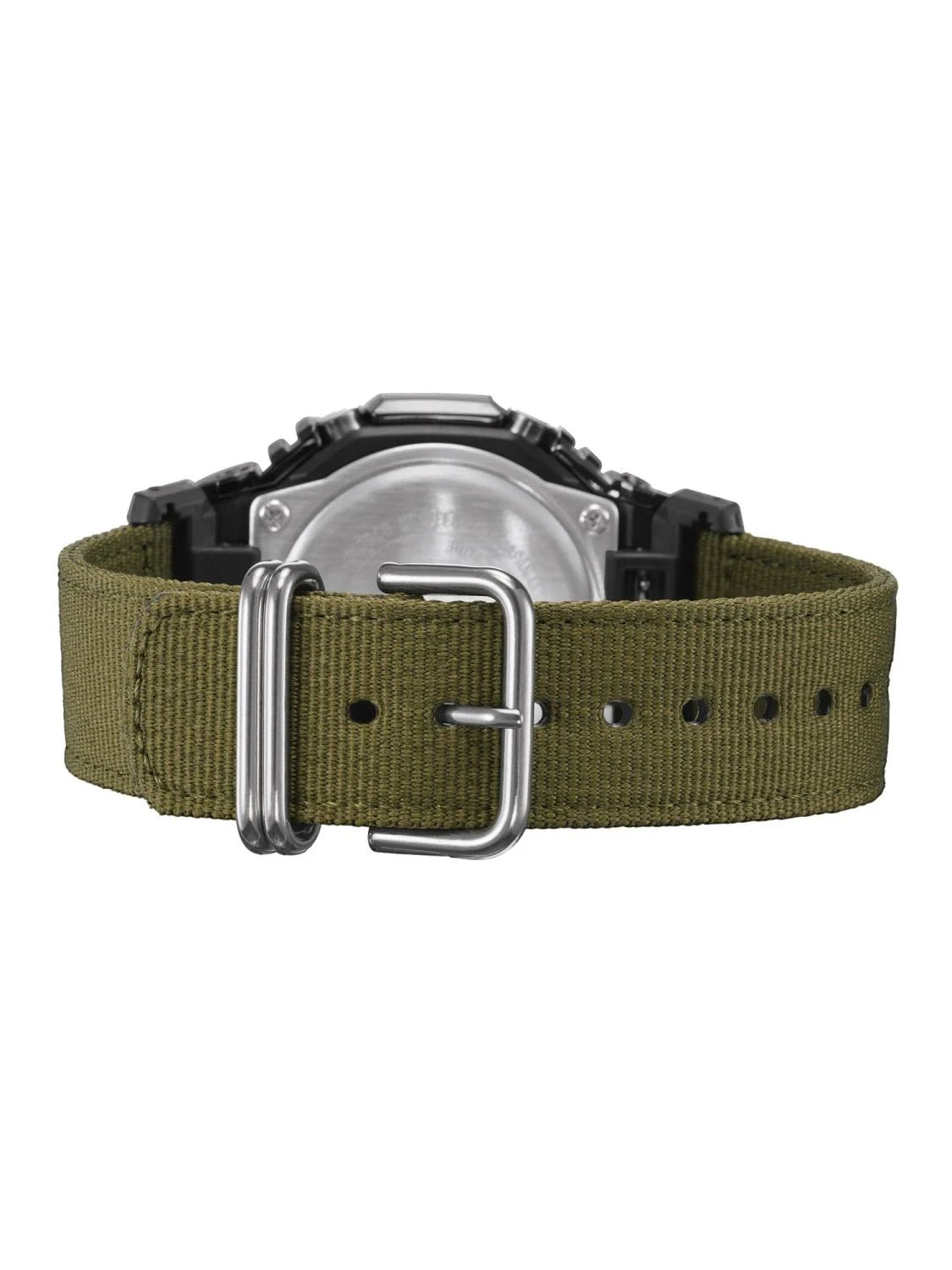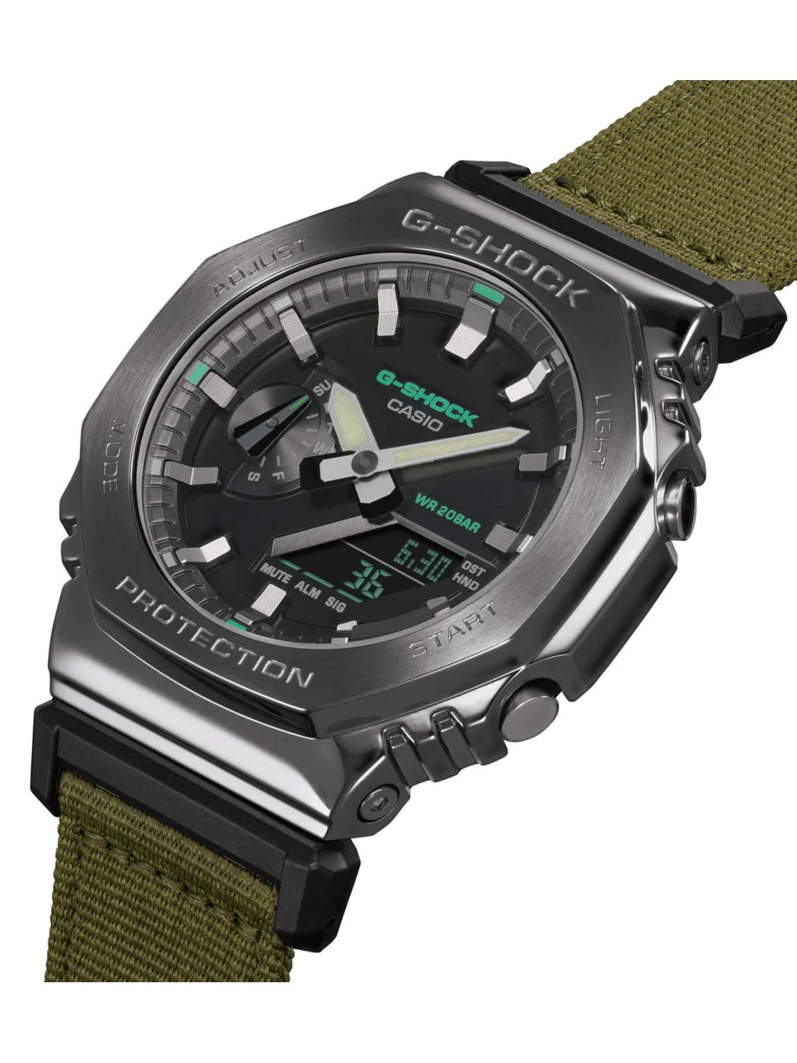 Die Klassik-Serie von Casio beinhaltet verschiedene Designs, die jedoch immer eine Brücke zwischen bewährtem Format und moderner Technologie zu schlagen weiß. Die GM-2100CB-3AER gehört zur gefeierten Casio-Linie, wobei das Resin-Gehäuse mit einer Edelstahlbeschichtung verstärkt wurde. In ihrer Mechanik verbindet sie Analoge und Digitale Komponenten, die von einem zuverlässigen Quarzwerk in Gang gehalten werden. Sie verfügt neben einer Weltzeitfunktion über einen automatischen Kalender, fünf individuell gestaltbare Alarme, eine Stoppuhr, ein Neo-Display und eine Druckresistenz von 20 Bar. Beleuchtet wird das schwarze Zifferblatt durch LED-Lights. Das grüne Textilarmband fügt eine Outdoor-Komponente hinzu, wohingegen türkisfarbene Akzente für einen futuristischen Gesamtlook sorgen.